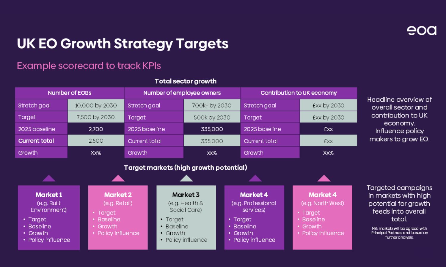 The eoa issued a statement that they were "blindsided by this 50% cut to CGT relief on sales to EOTs." As yet, there is no evidence on the association’s website of any recalibration of the targets considering this new fiscal reality. Placeholder text like "£xx by 2030/xx%" signals unfinished analytical work, suggesting revisions were still forthcoming.