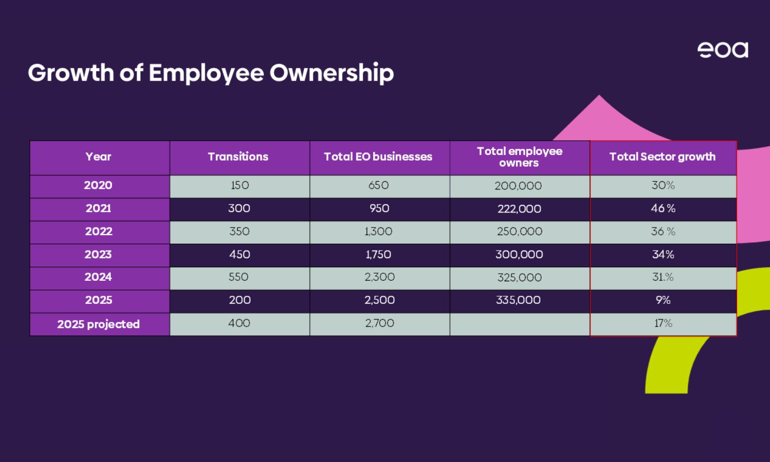 The growth in employee-owner numbers implies an average of perhaps 50-70 employees per new EO firm, plausible on paper but ignoring the skew toward small professional-services and construction firms where headcount is often low. The targets require either dramatically larger businesses joining the sector (which means fewer SME transitions as these tend to have fewer employees) or a sudden acceleration that has no historical precedent.